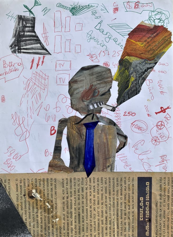 Melancholy - collage series is created using a distinctive artistic technique that blends layered papers, mixed media, and rich color palettes.